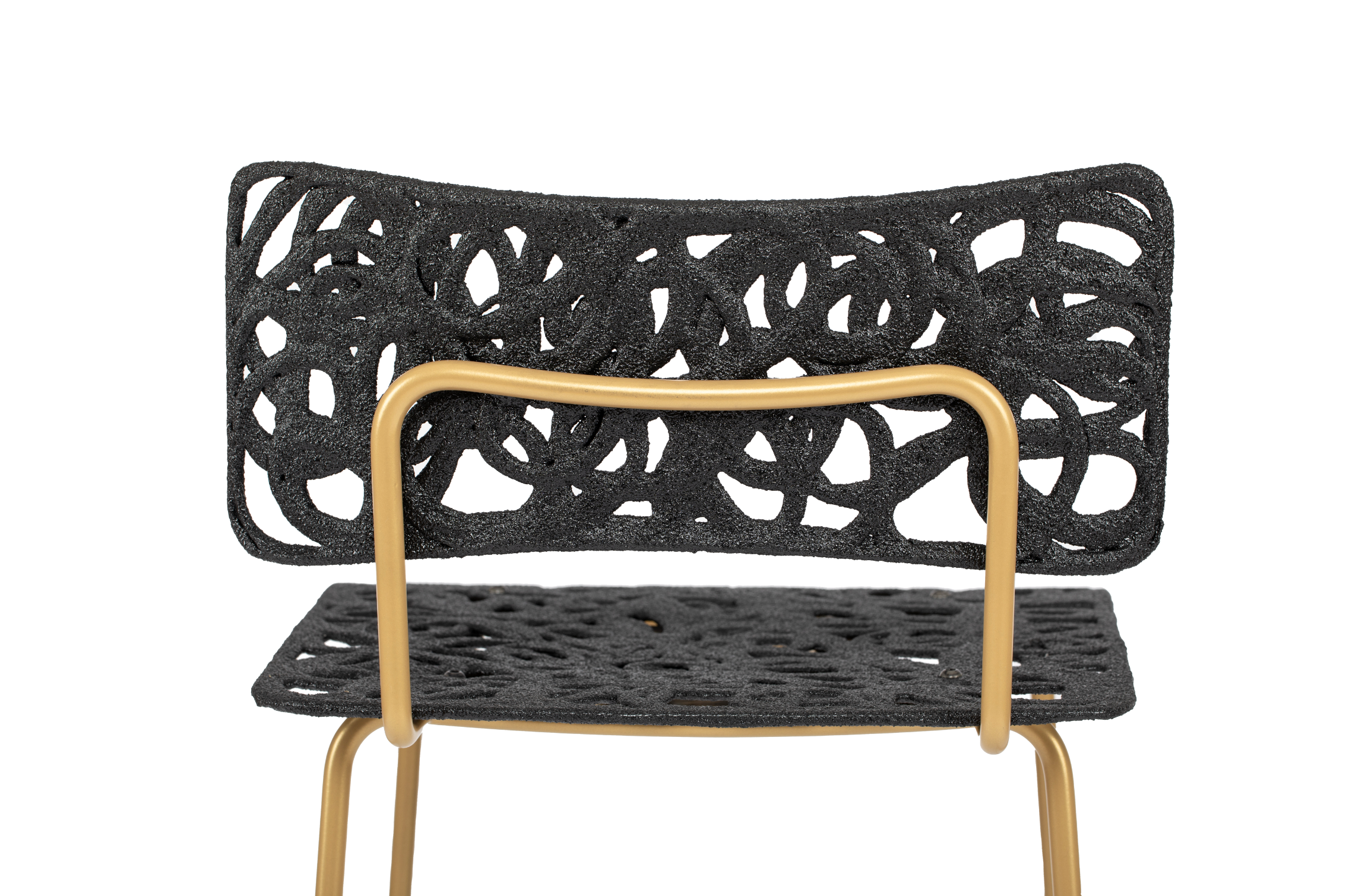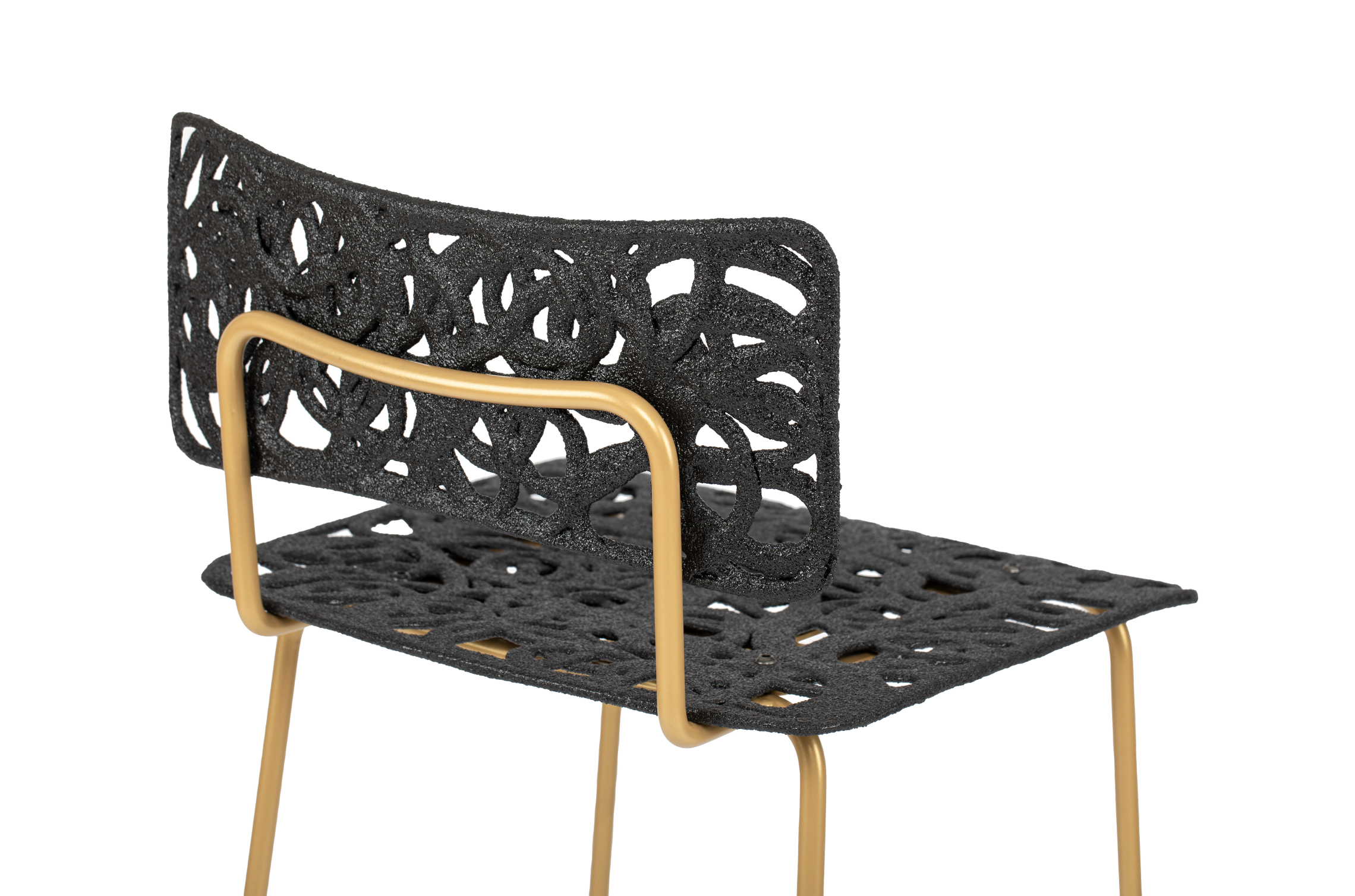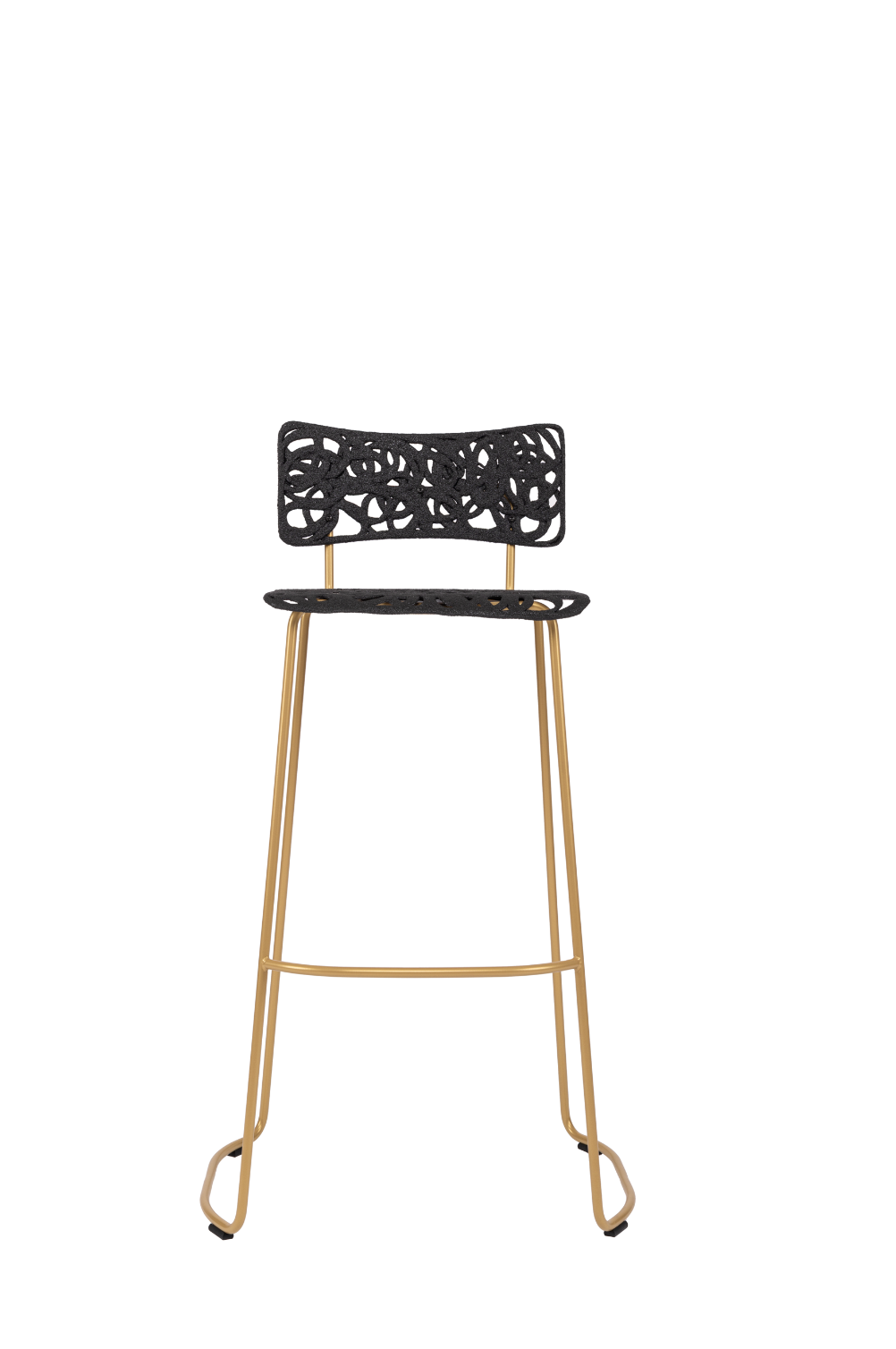 Created through the collaboration between Luciani SRL, a historic Italian manufacturer specializing in metal structures, and Etna Design, known for its basalt-fiber creations, this bar-height chair embodies both industrial precision and aesthetic lightness.